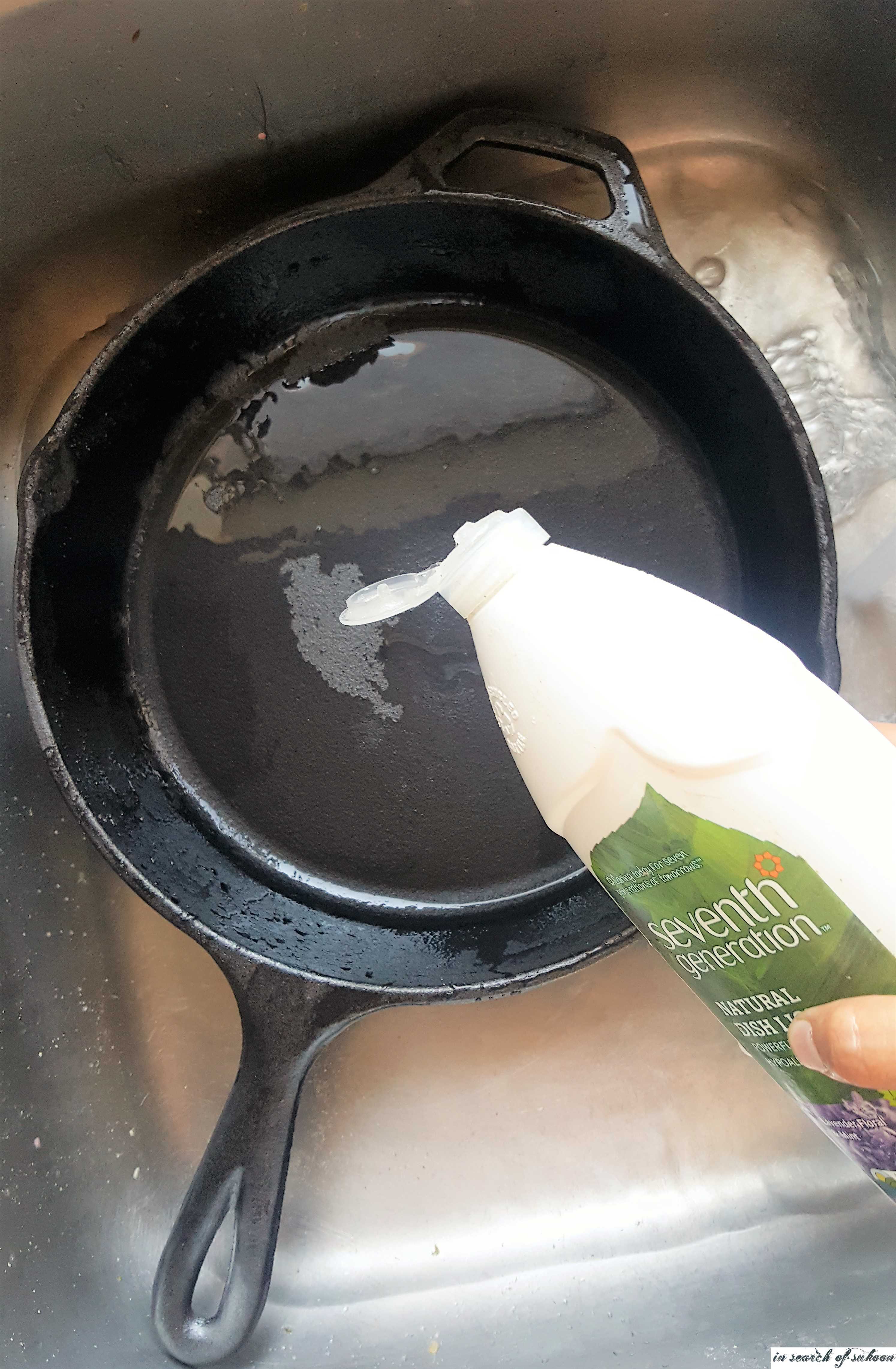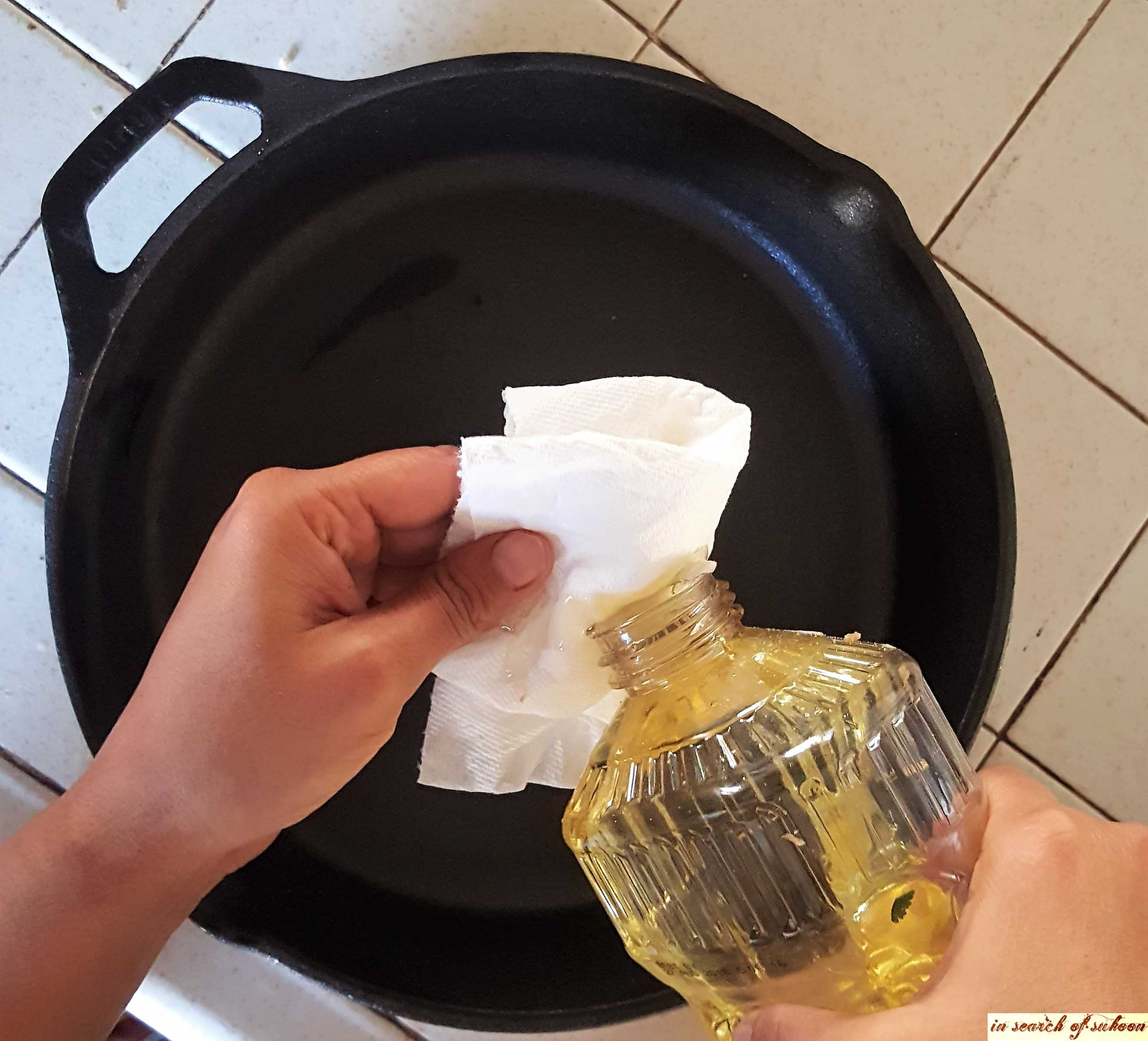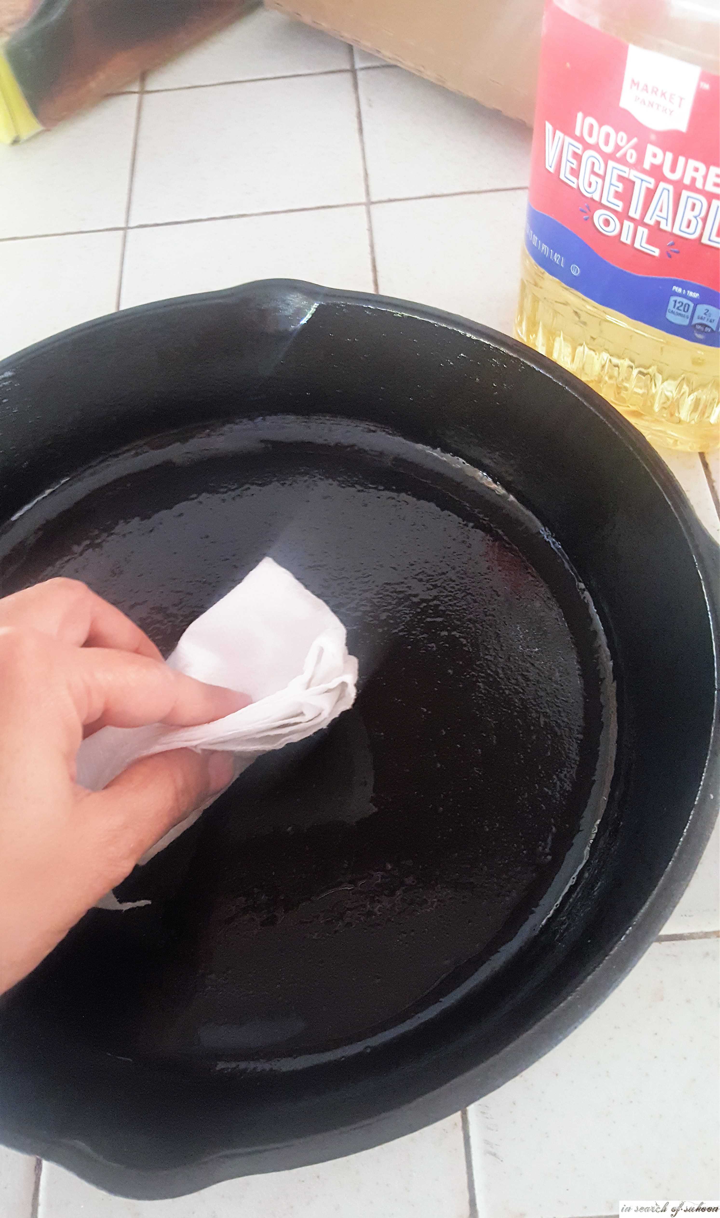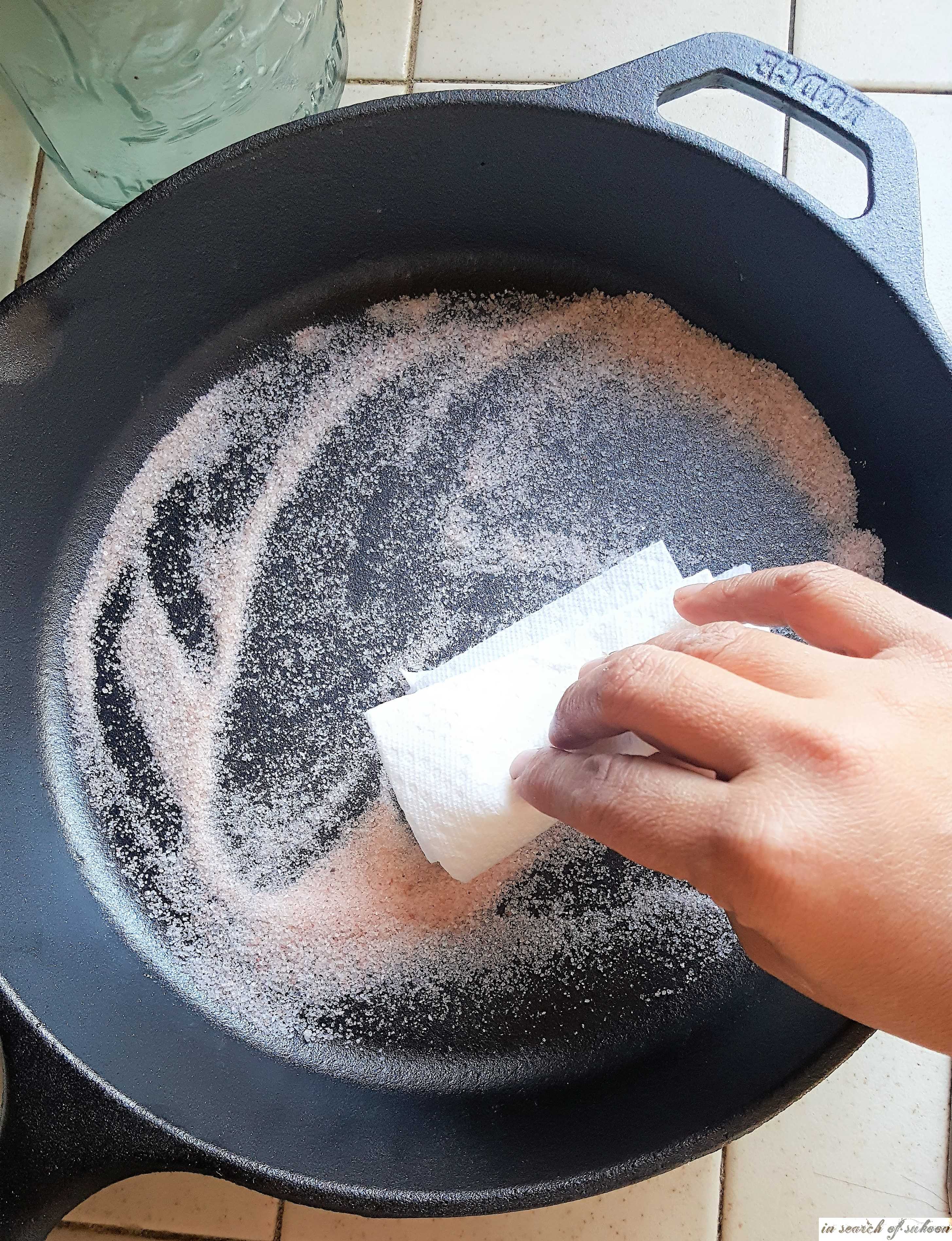 Add two tablespoons of salt and scrub with a paper towel. (Do this step only if there is food stuck on the skillet).