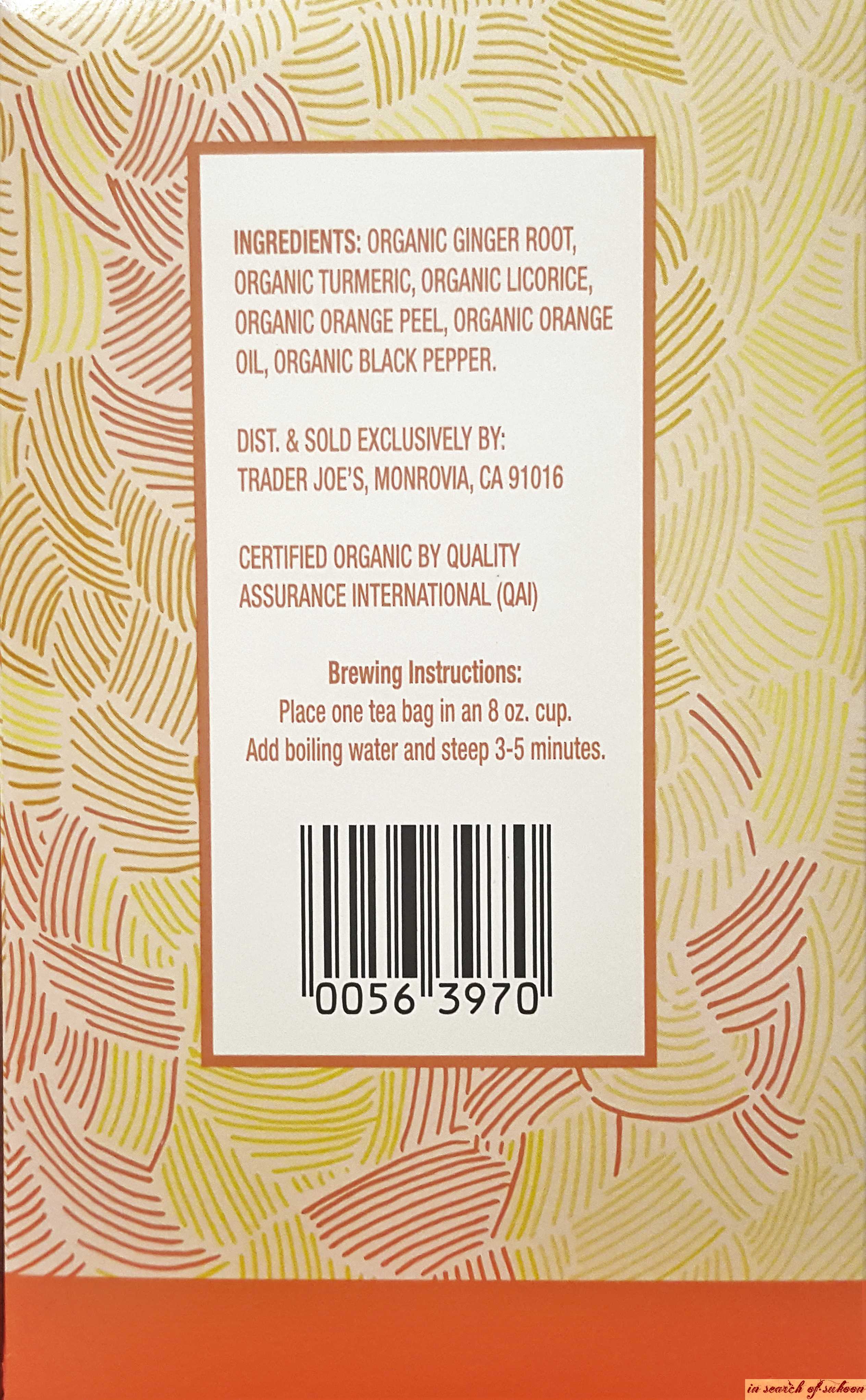 By now we all know the benefits of Ginger and Turmeric so when I saw “Organic Ginger Turmeric Herbal Tea” on display at Trader Joes, I did a happy dance (okay not literally but in my head). For $2.49 you get 20 individually packed organic tea bags which is a killer deal. Trust me, organic teas are not so cheap. As it is a new launch, I will provide the link to buy the tea once it becomes available online.