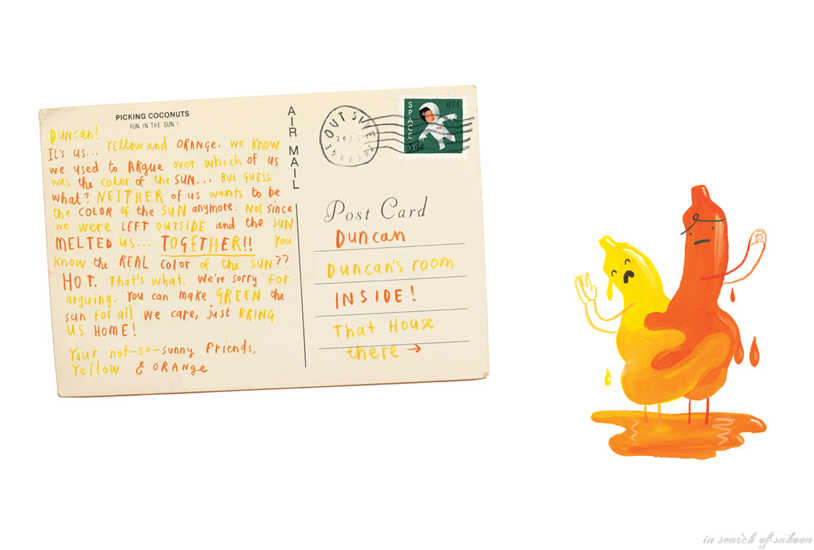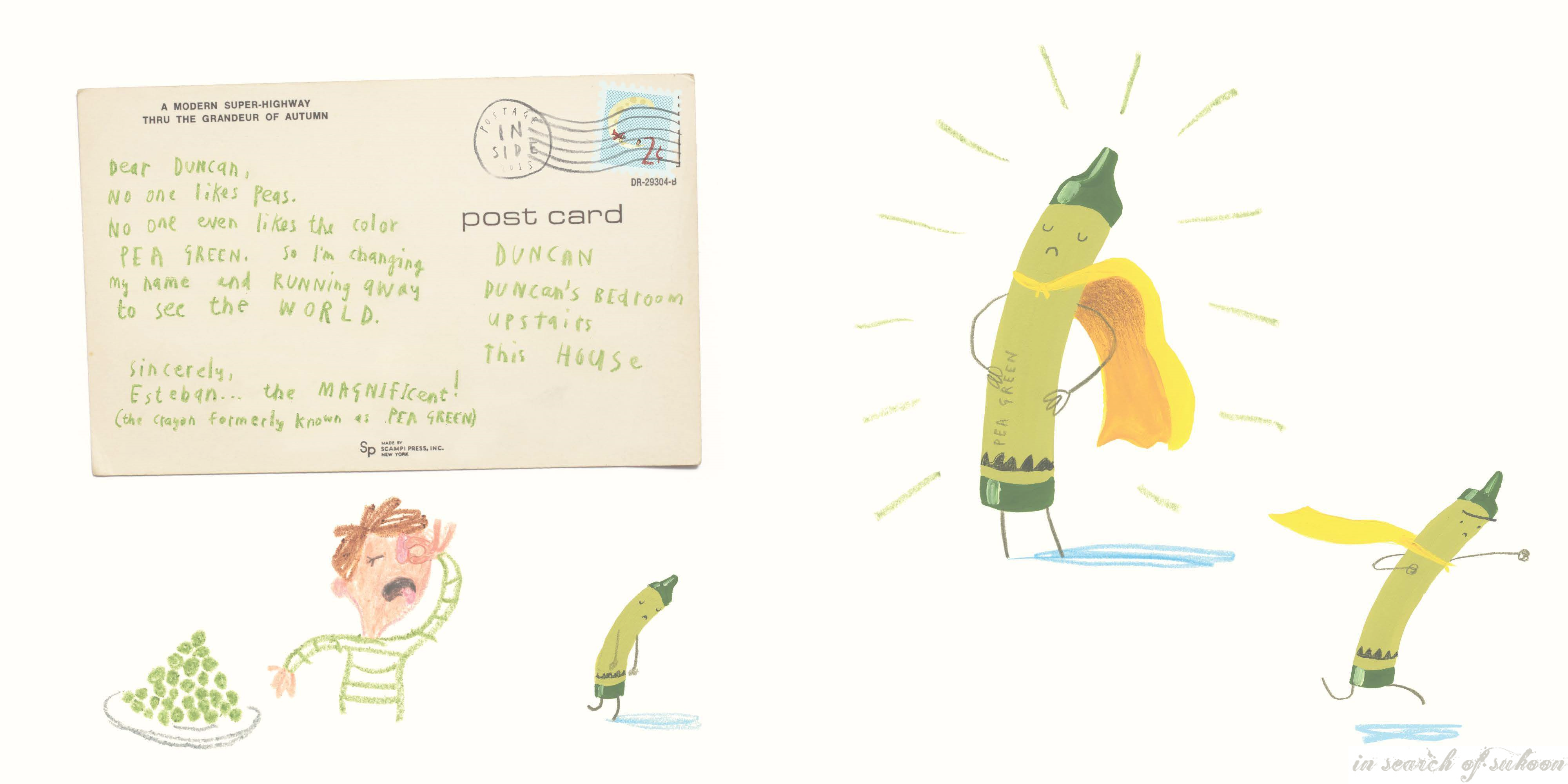 The story revolves around Duncan’s missing crayons. The true stars of the book are the crayons which have been neglected by him and how he deals with them. The send hilarious postcards to Duncan to tell their stories and their whereabouts. Each postcard is more interesting than the previous one and you will be reading them over and over again. The textured, glow in the dark Halloween drawing was very cool.