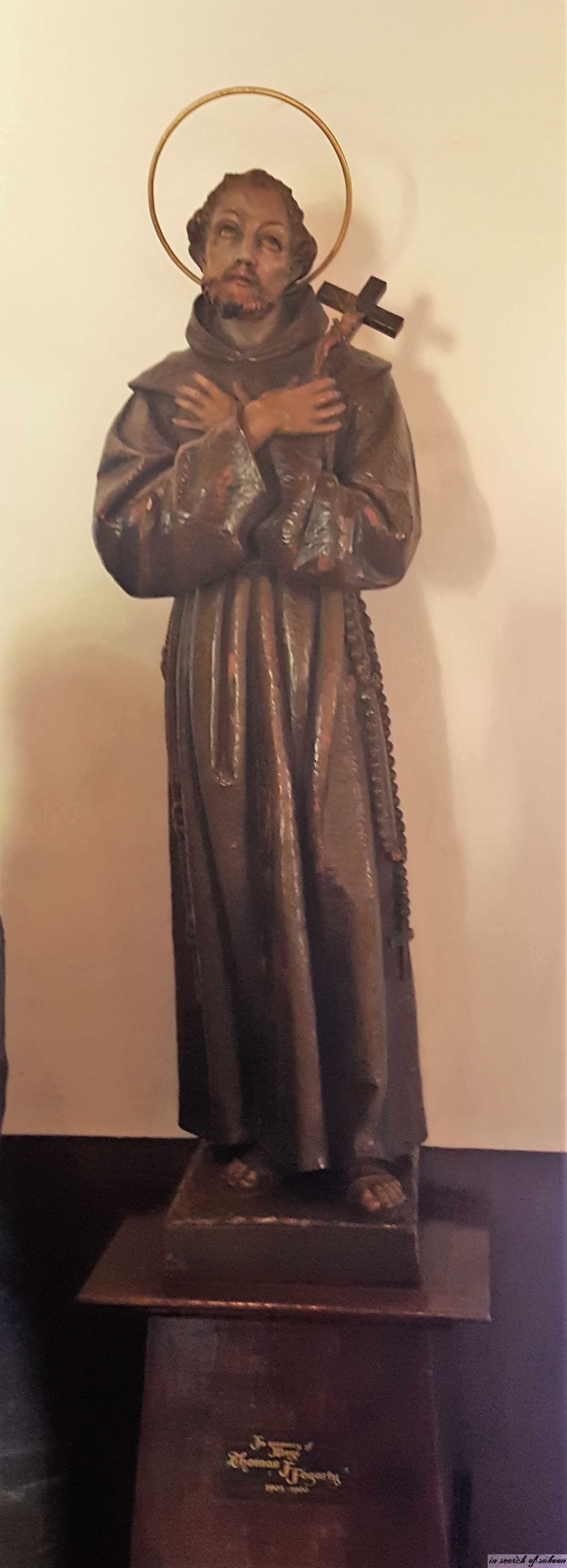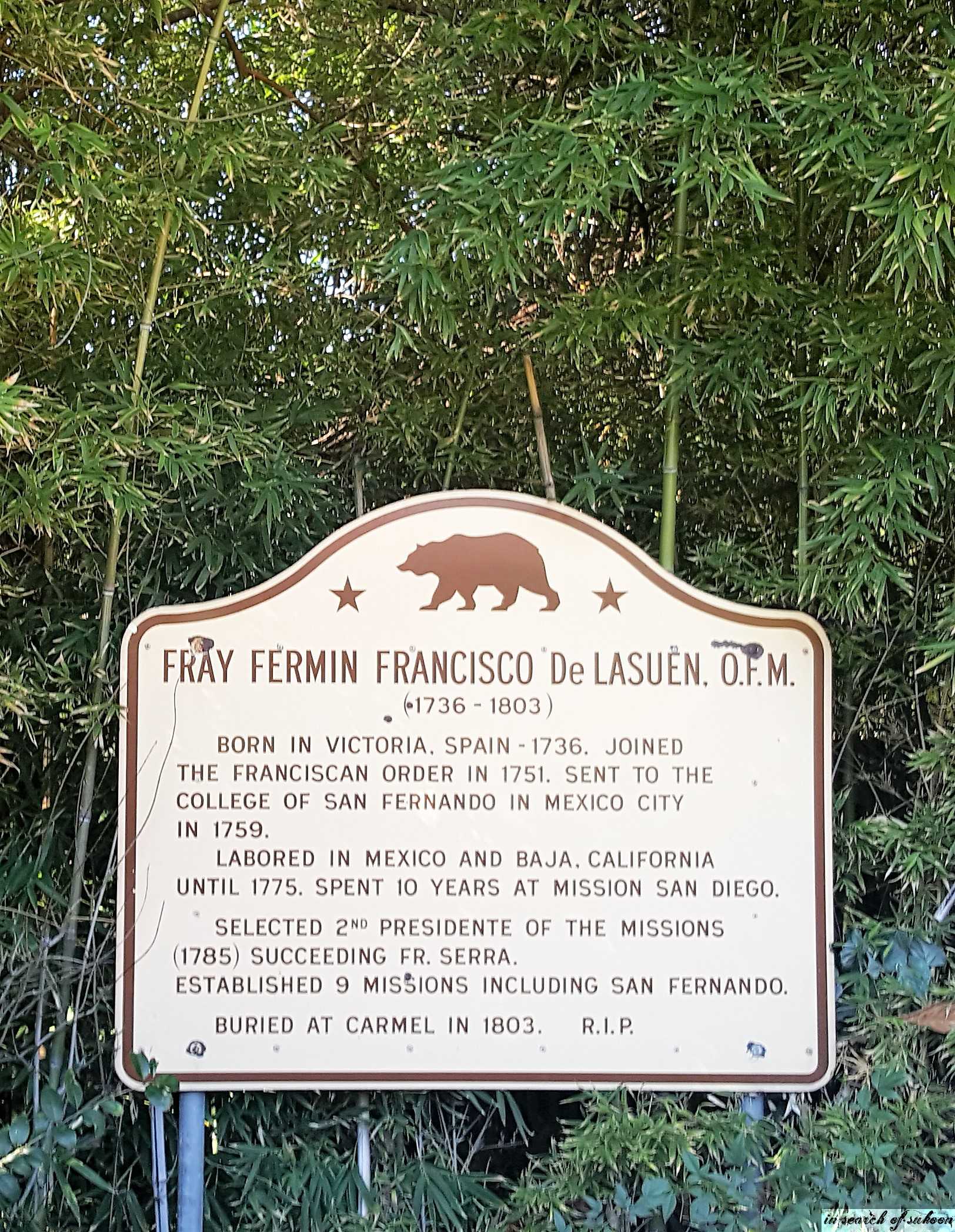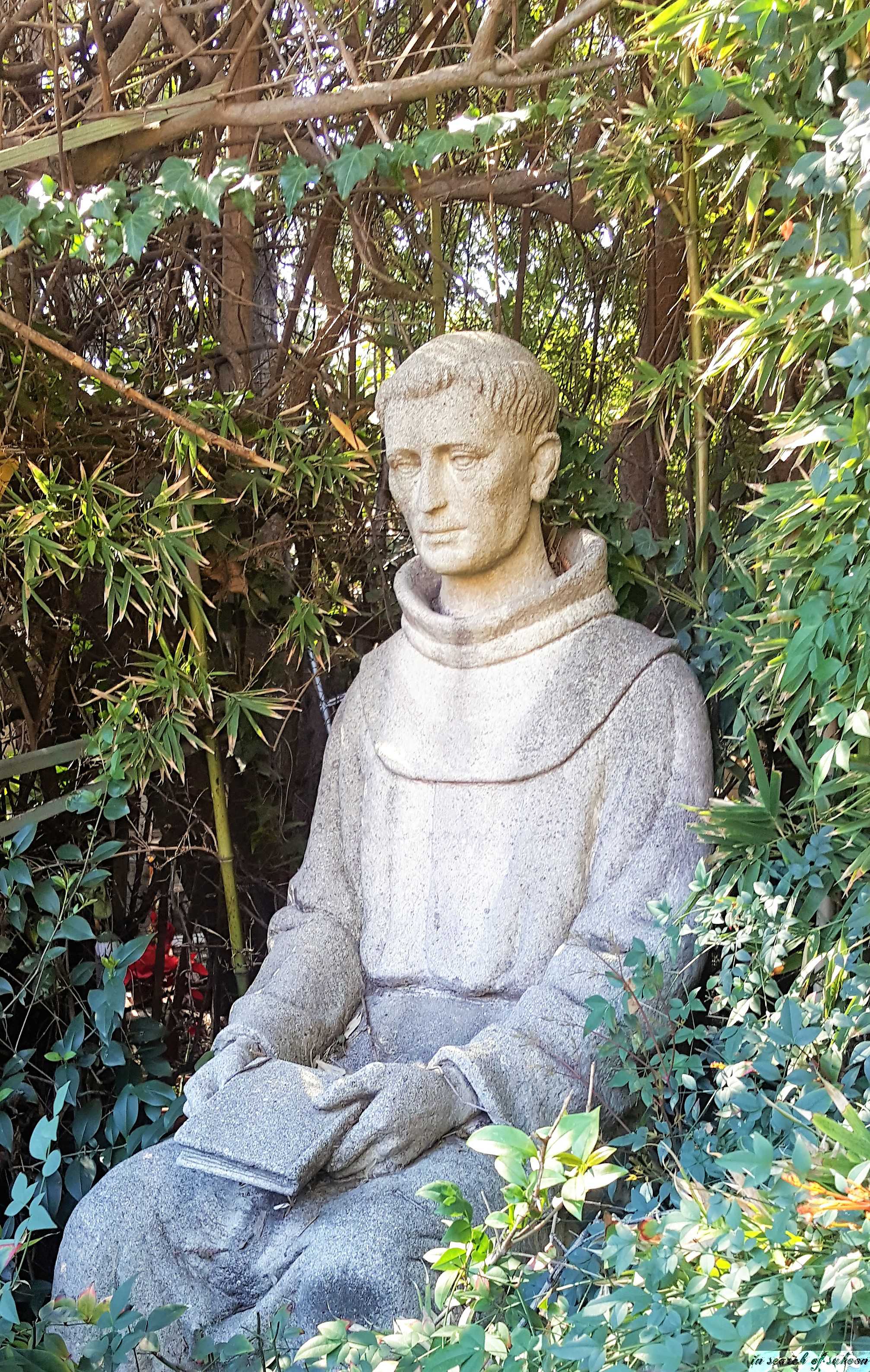 A statue of Fermín de Francisco Lasuén de Arasqueta, president of the Franciscan missions and the founder of 9 out of 21 missions in Alta California sits amongst the greenery.