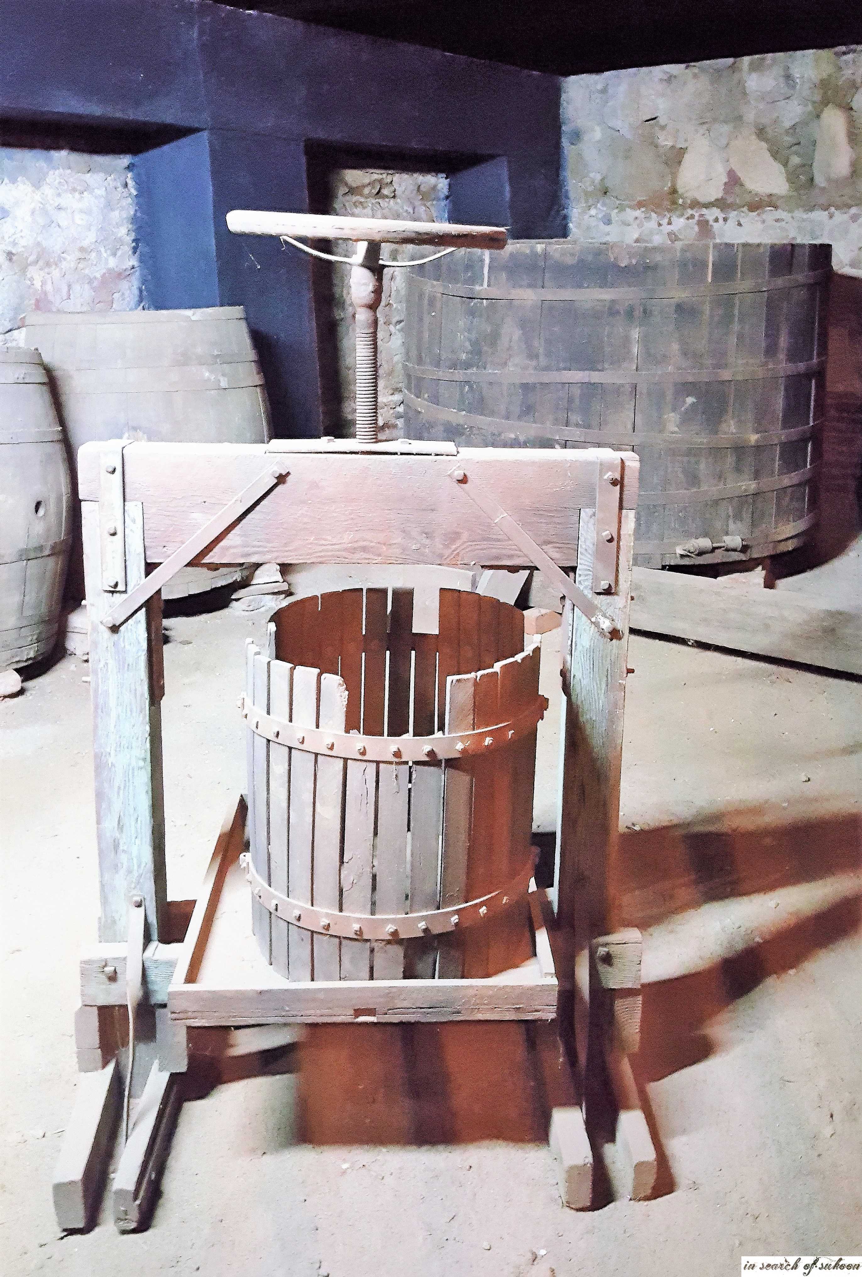 Close up of the painting aboveWine PressStorage Barrels