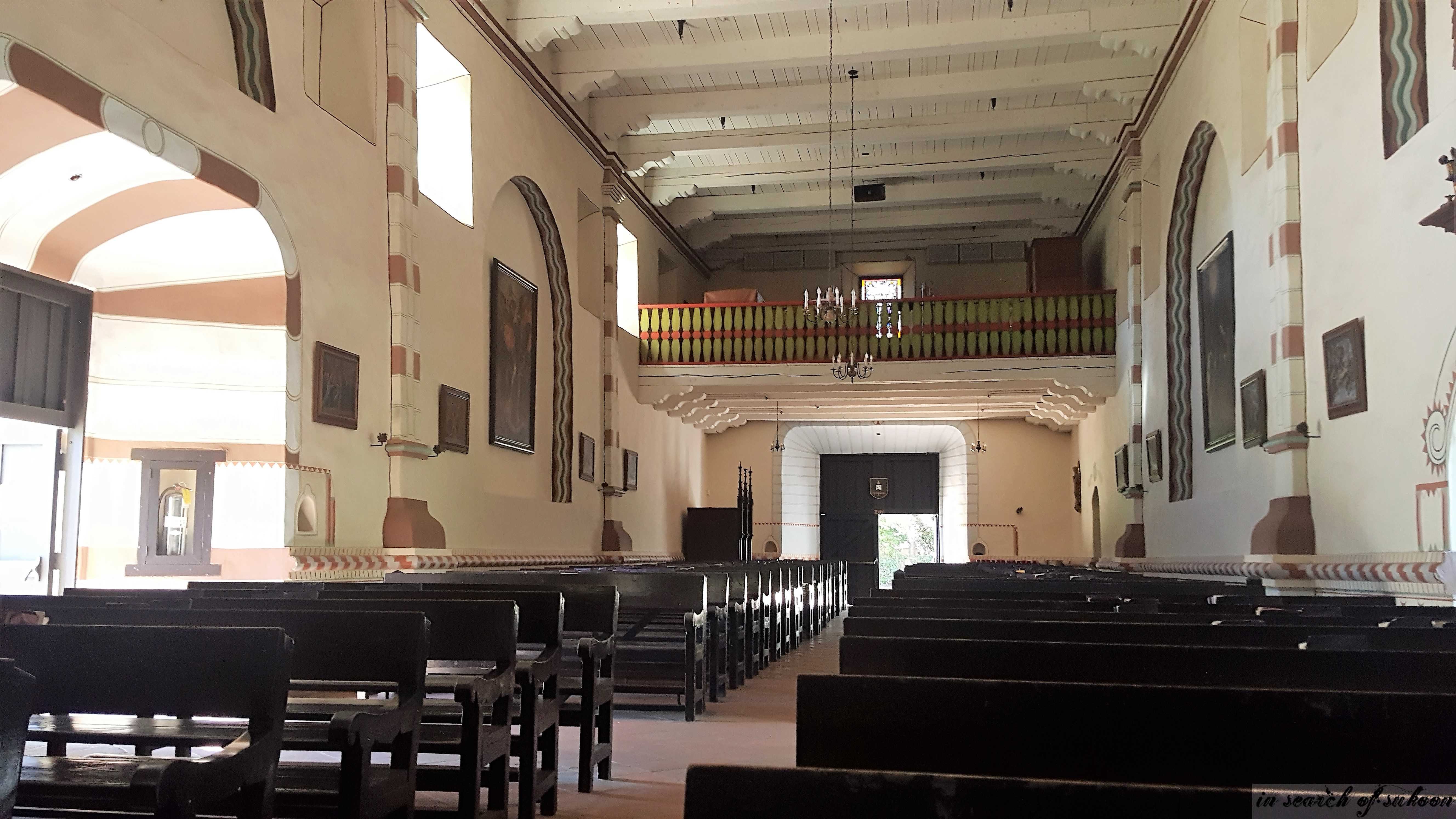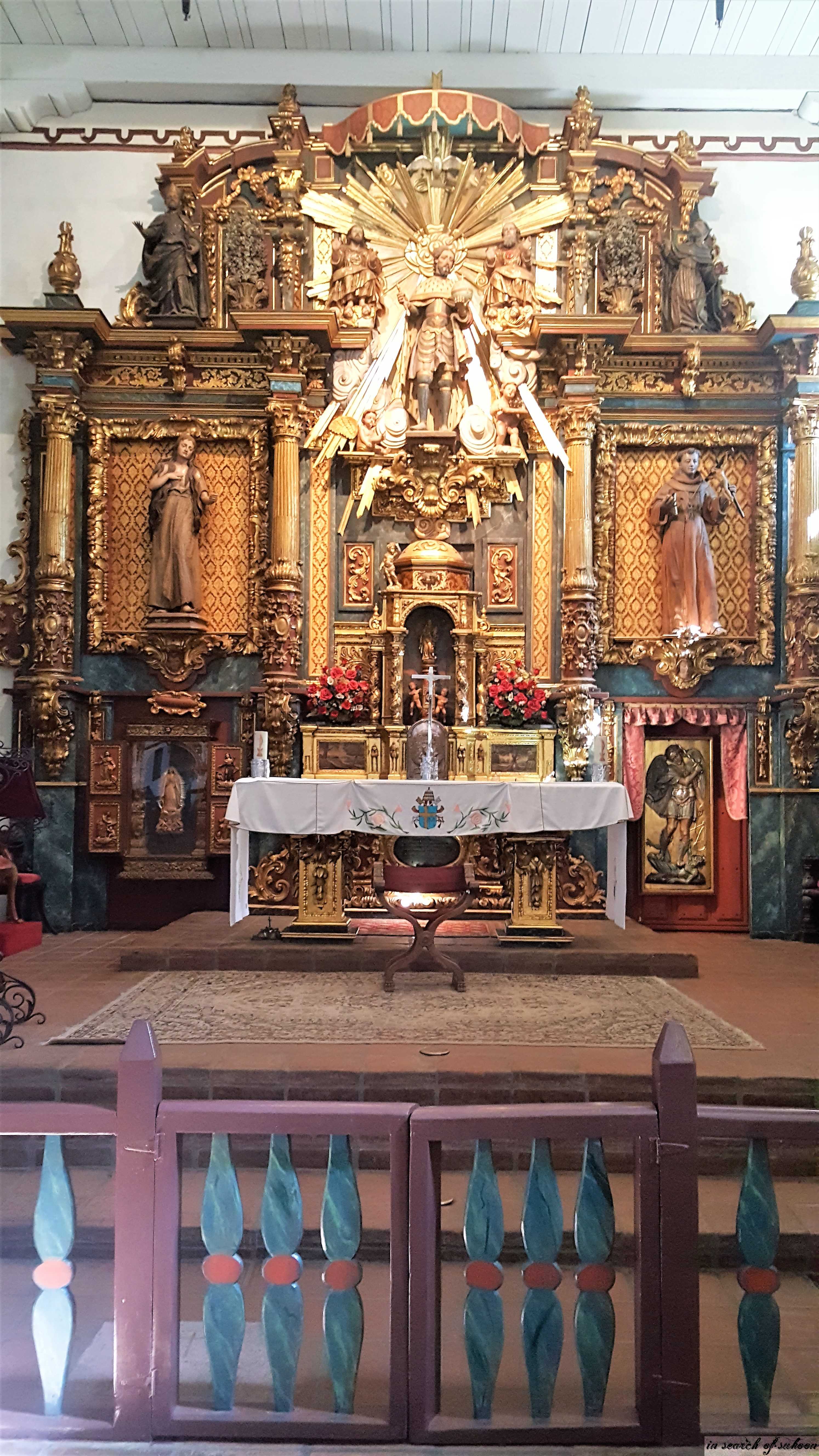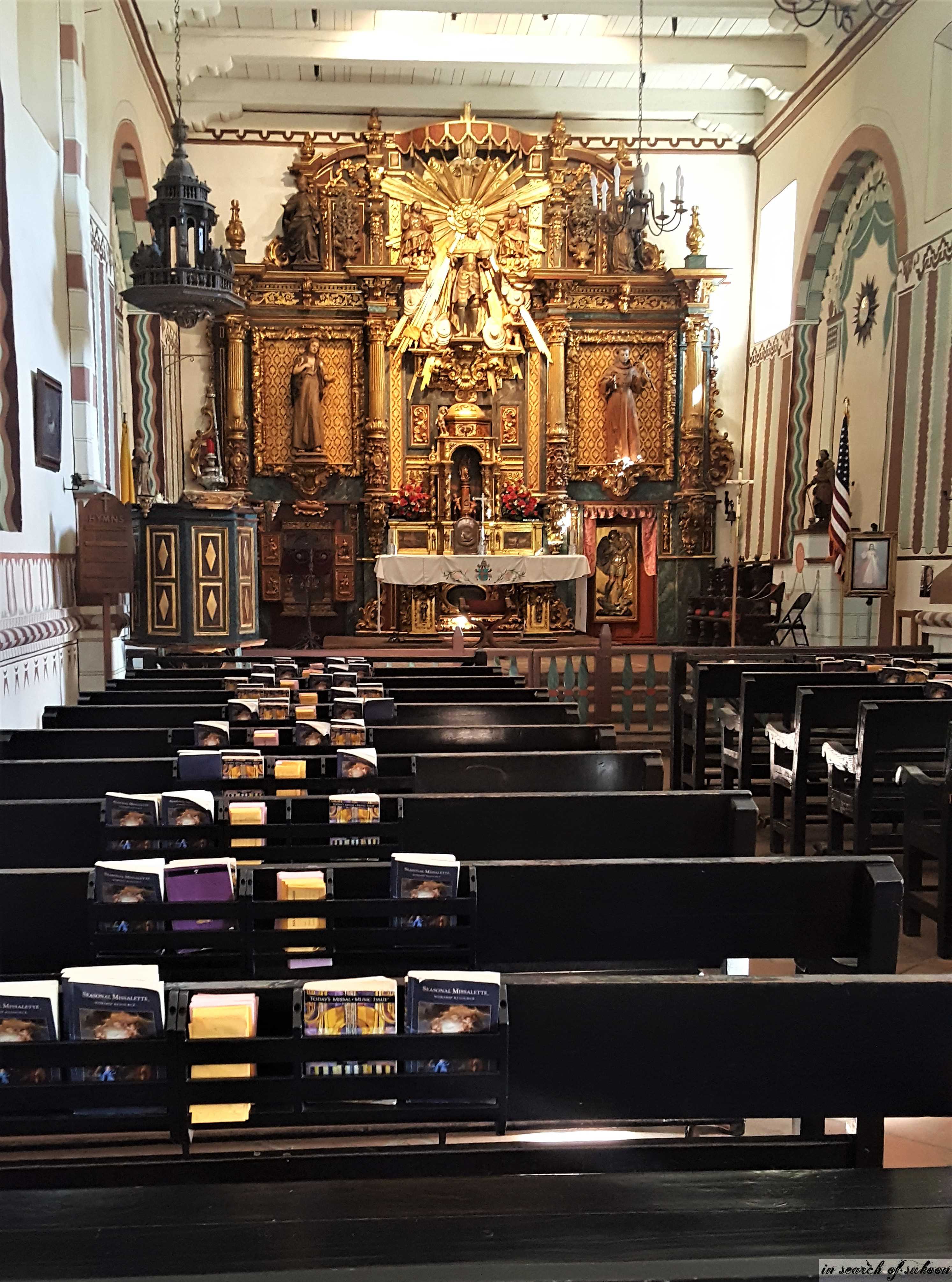 As you enter the Church from the main plaza you will notice two rows of pes with a center isle leading to the Altar. The Altar is 400 years old and was imported from a church in Spain. It is made up of a lot of small parts and is not one solid construction. A pulpit sits on the left side of the altar.